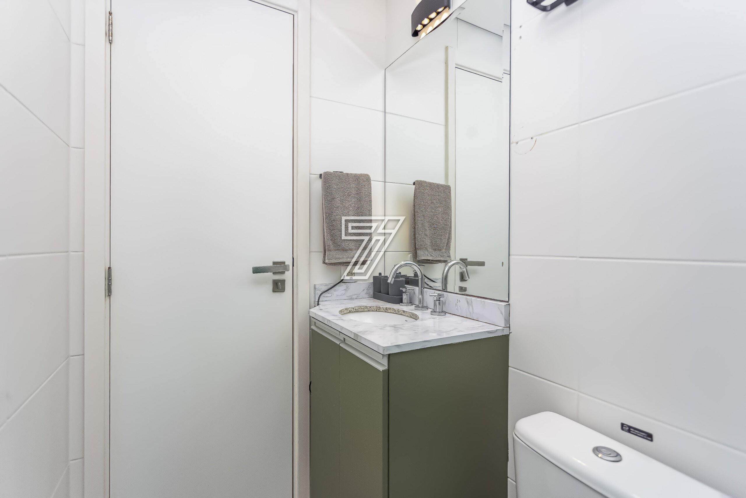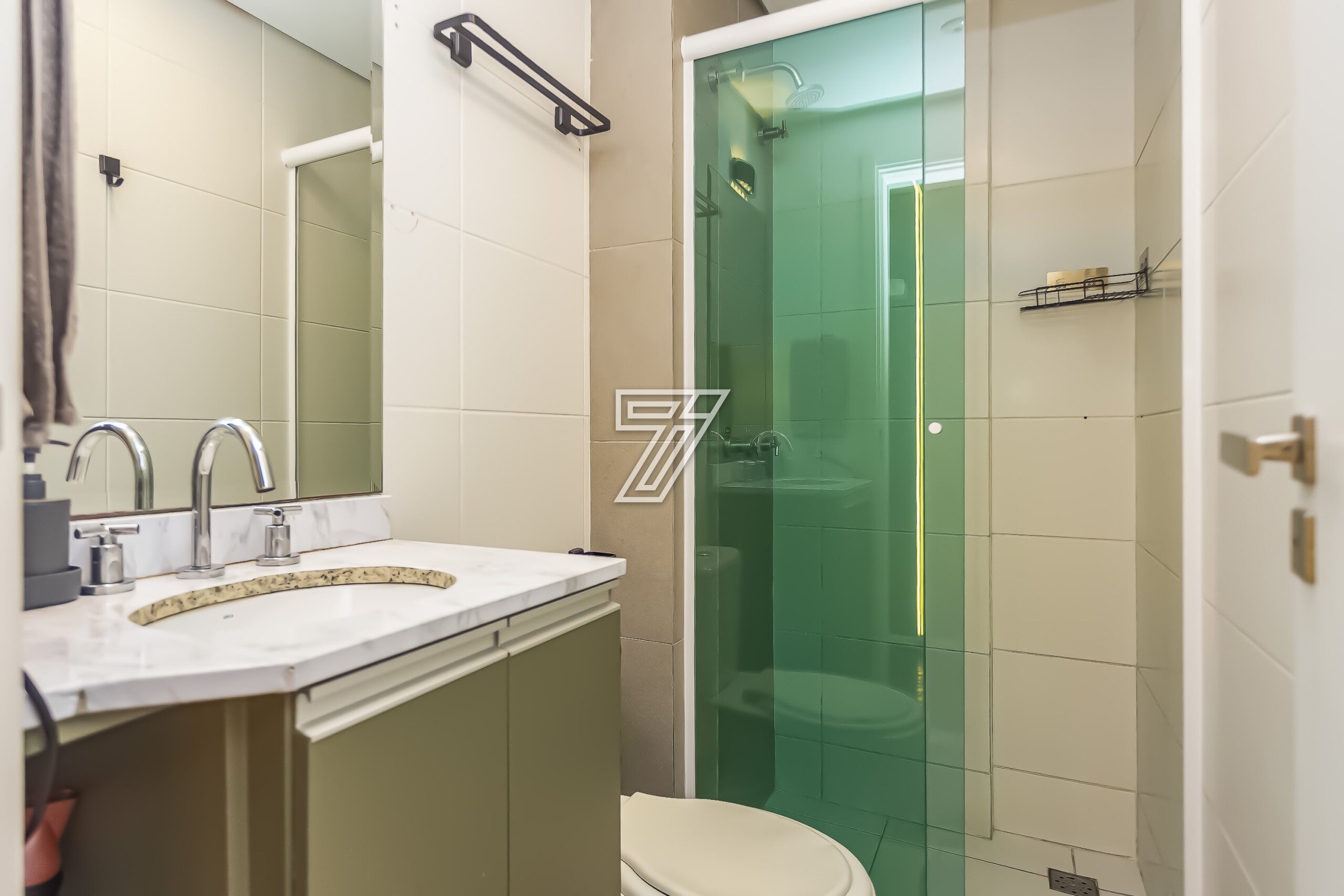 Banheiro social com box de vidro, armário e espelho;