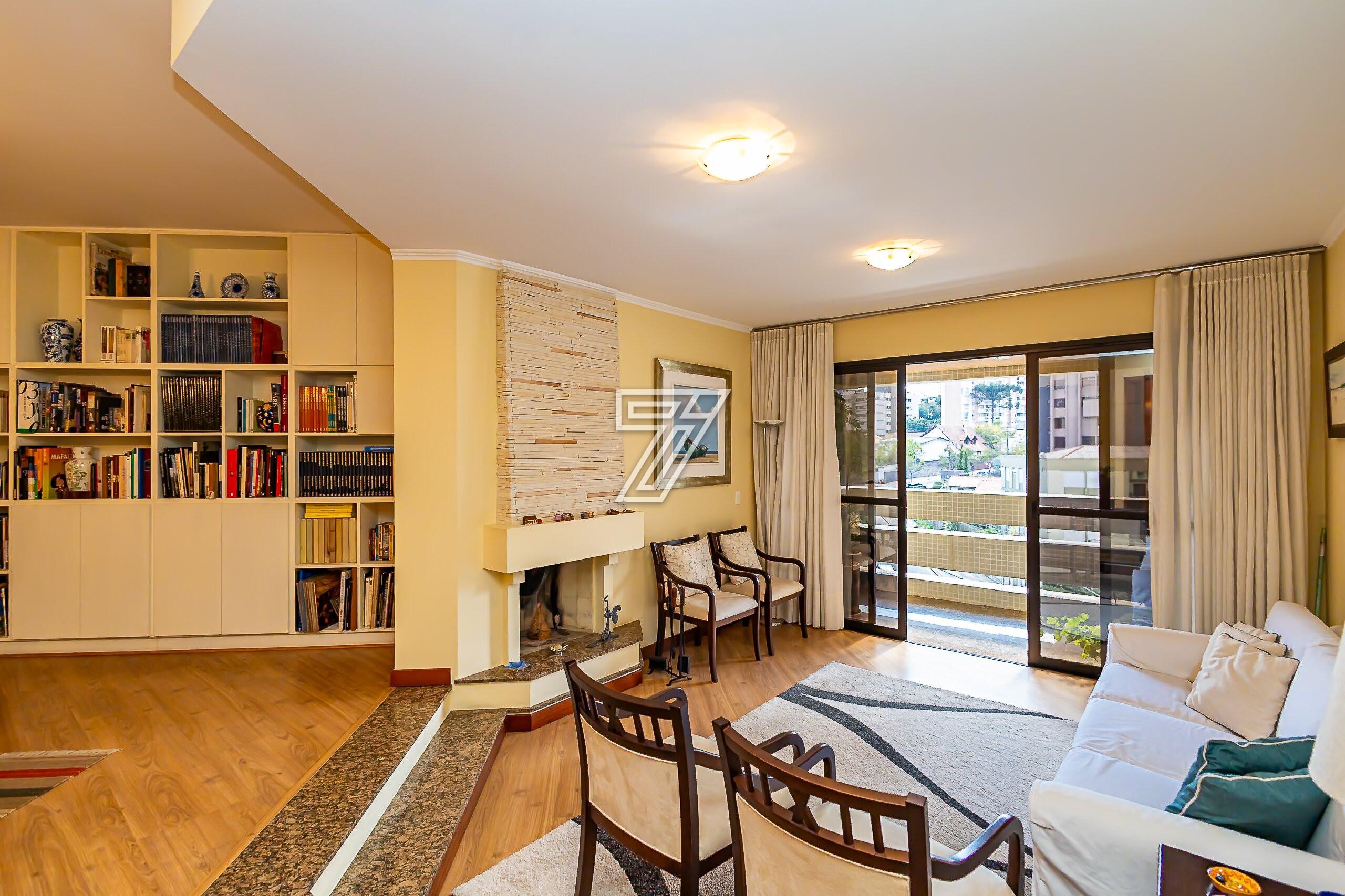 Possui sala de jantar, com lavabo, sala de estar com lareira, sacada.